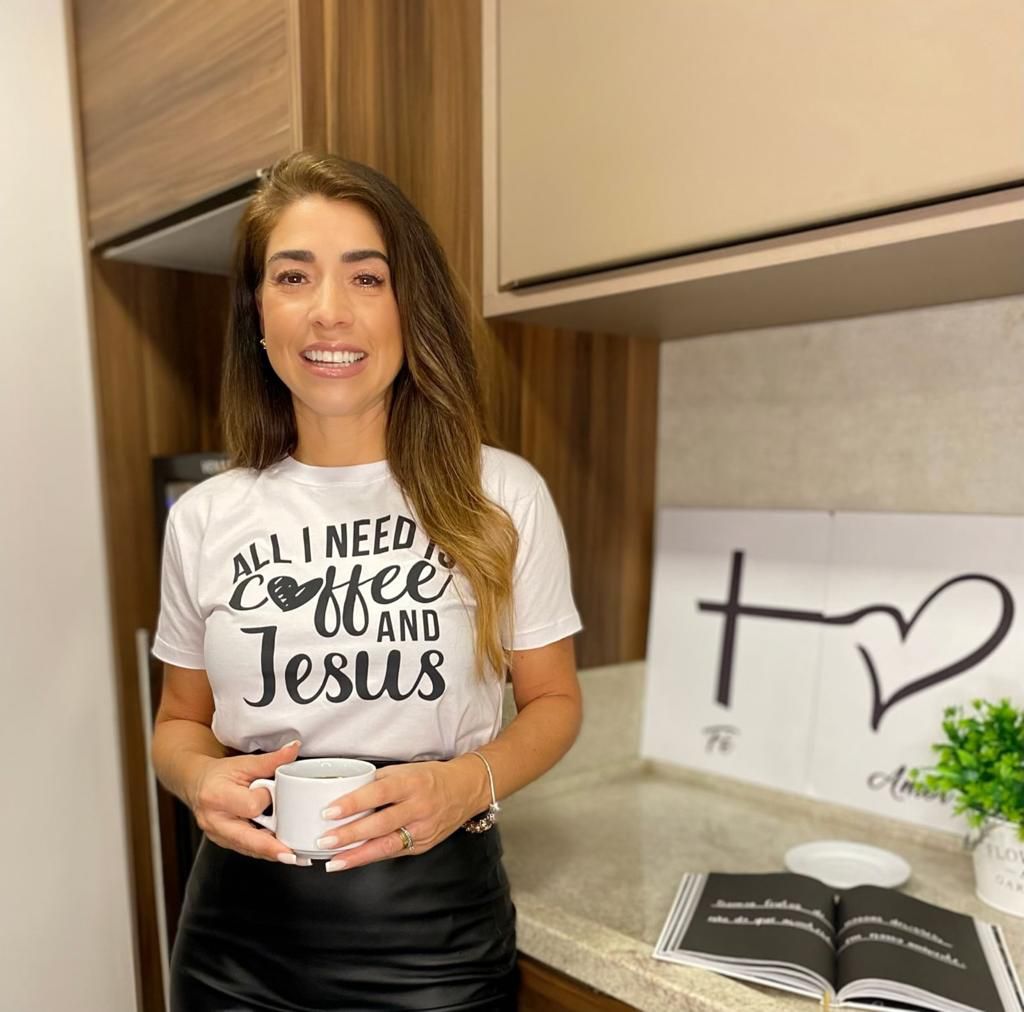 A camiseta Café e Jesus é para todas as mulheres que amam iniciar o seu dia da melhor maneira: Na Paz de Jesus e um bom café.